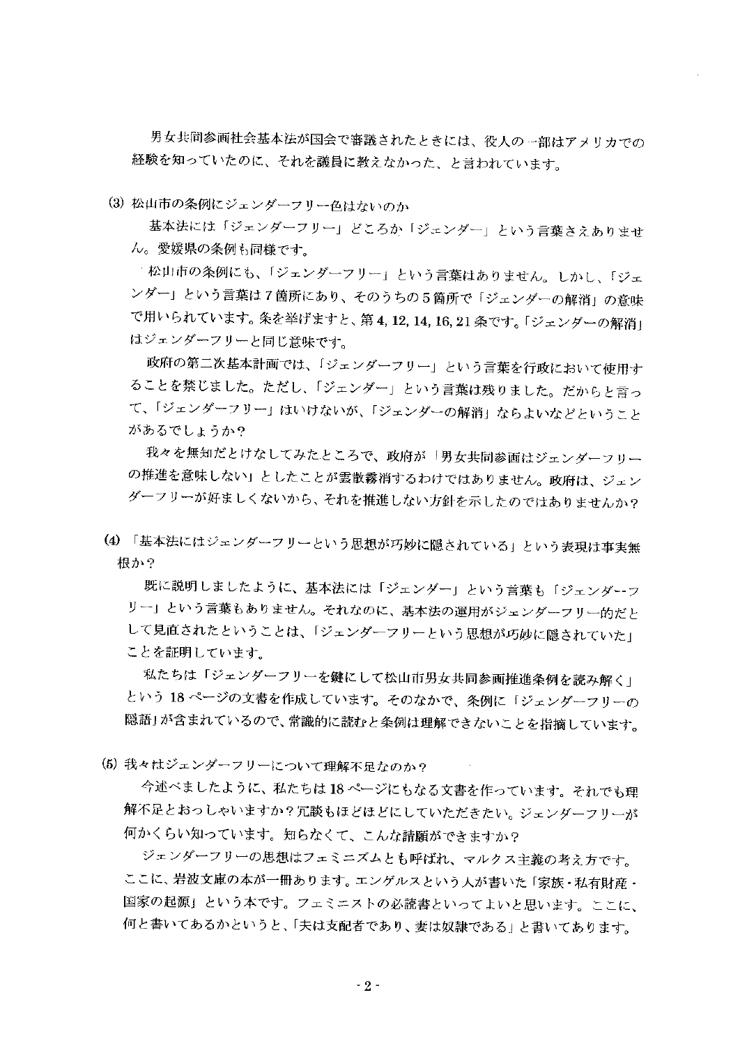 2007年12月、松山市議会に提出され賛成多数で採択されたGFB請願は、本会議での採決の前に市民福祉委員会で審議されたのですが(賛成多数で採択)、そこでの議論の際、参考人が招致されました。その提出資料です(jpg画像。フルテキストは準備中)。